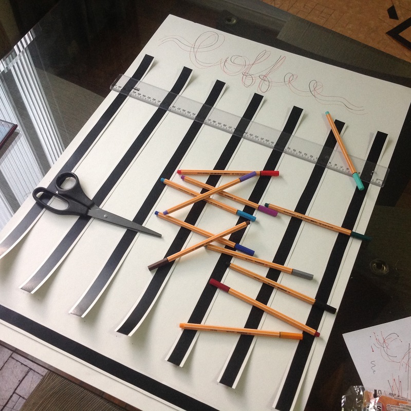 Para começar, eu cortei 8 tiras de cartolina com 47,5 cm de comprimento por 2,5 de largura. Em cada uma, passei a fita isolante no centro para enfeitar e colei a fita dupla face na parte de trás, deixando ainda a proteção da fita. Usei estilete pra dar acabamento melhor ao corte. Assim:
